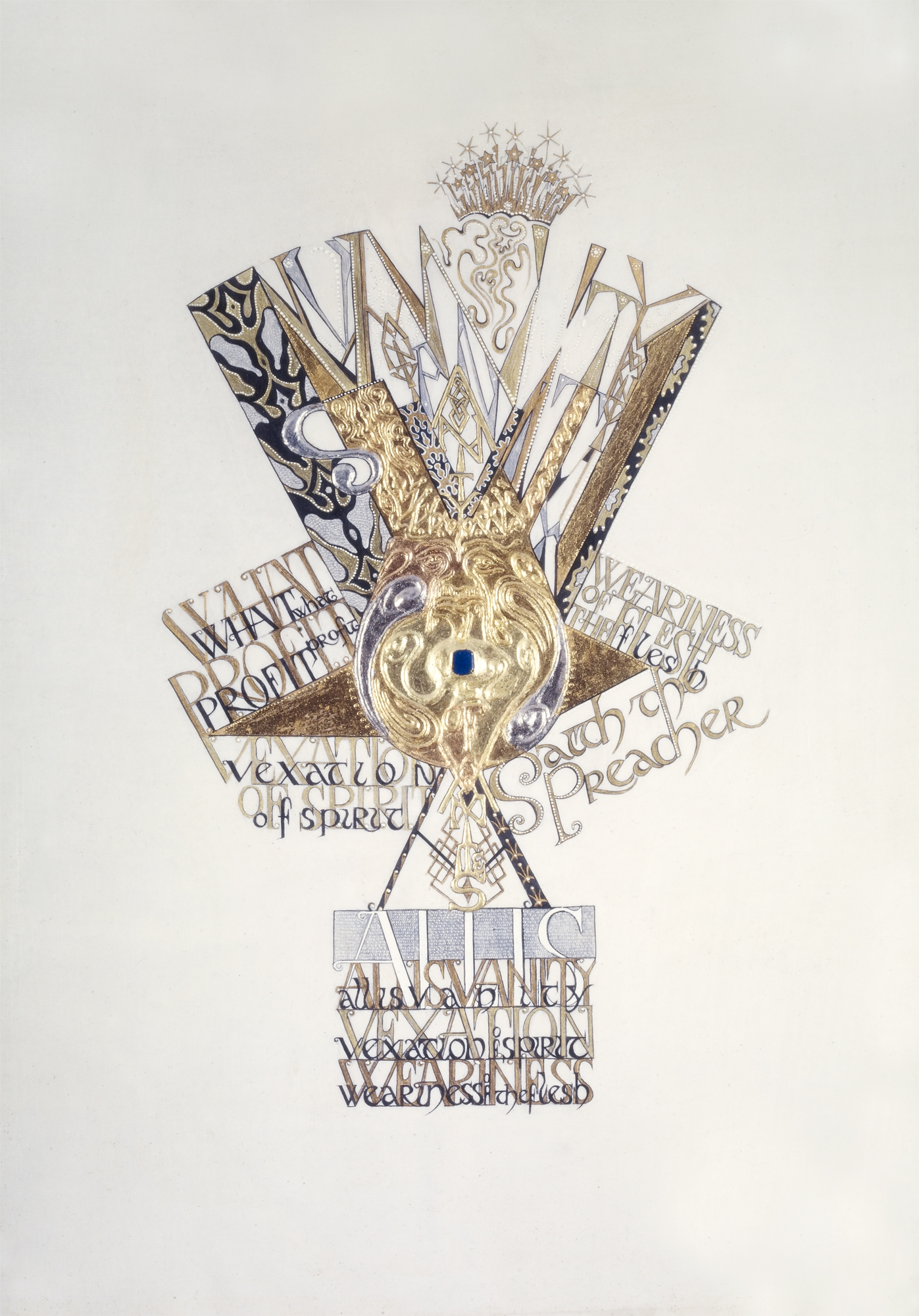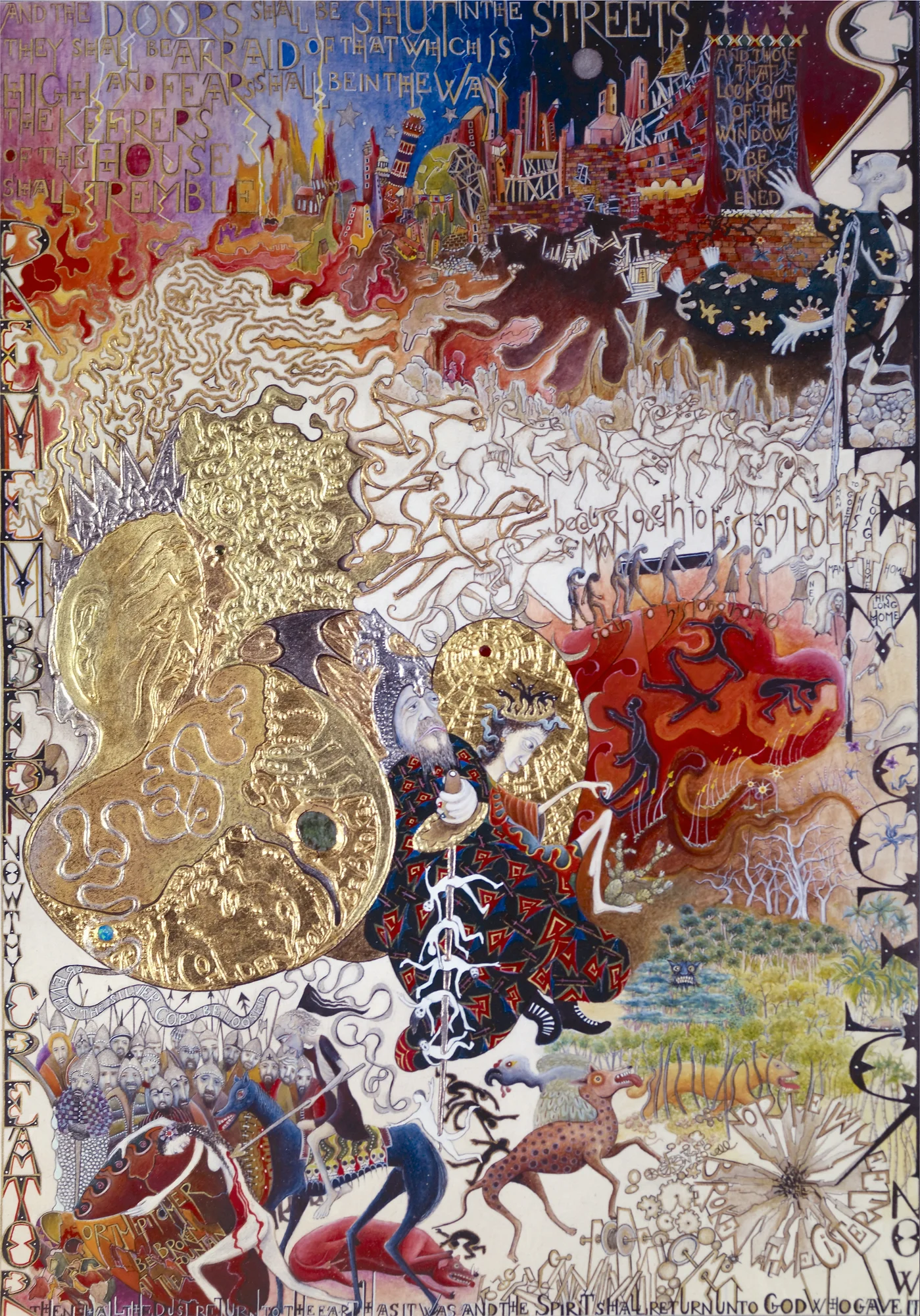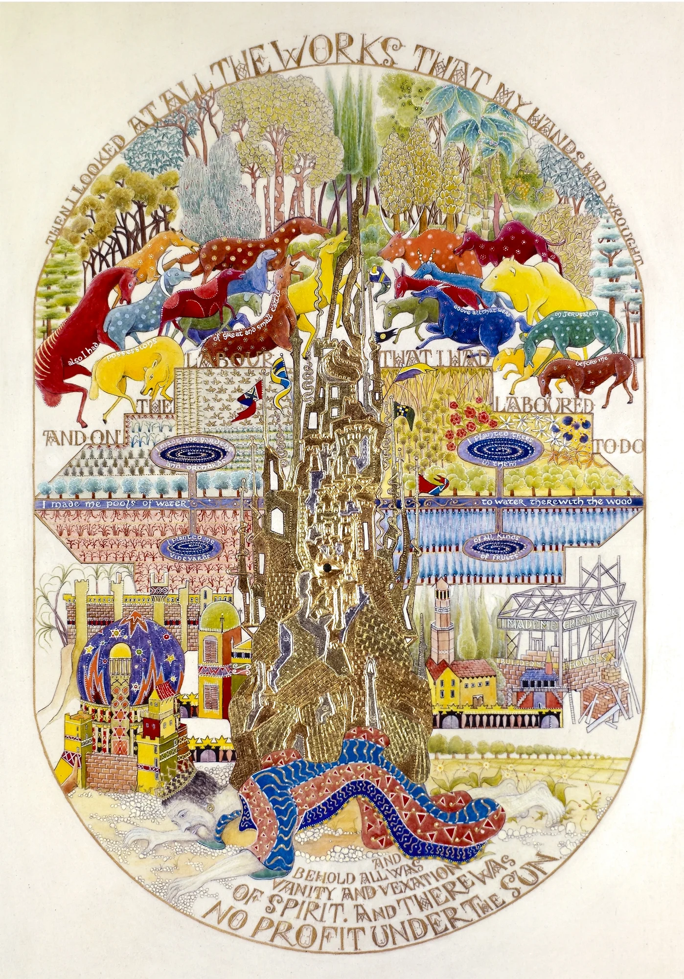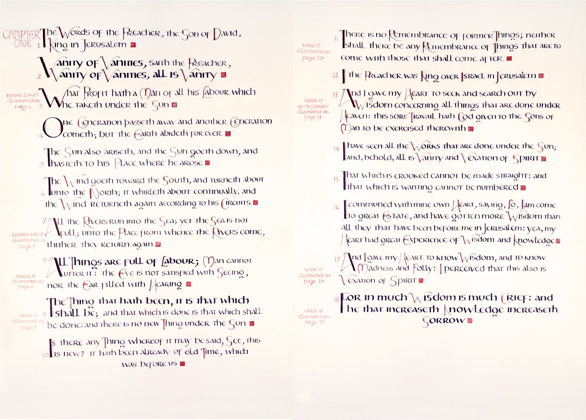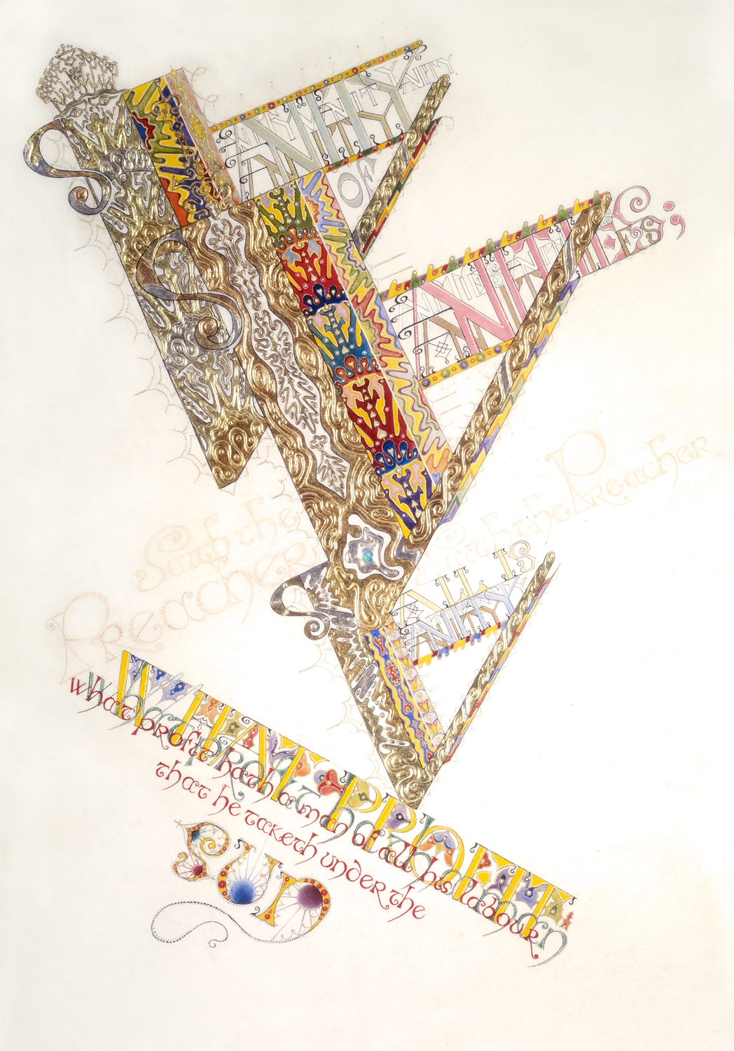 Ecclesiastes is an illuminated manuscript on 67 pages of vellum made with egg tempera, gold and silver leaf, precious and semi-precious stones. It was privately commissioned and took six years to make. It includes 34 illuminations, which you can see below, 32 pages of calligraphy and one title page. The size of each page is 28x42cm. Facsimile prints of the original manuscript available as single or double pages.