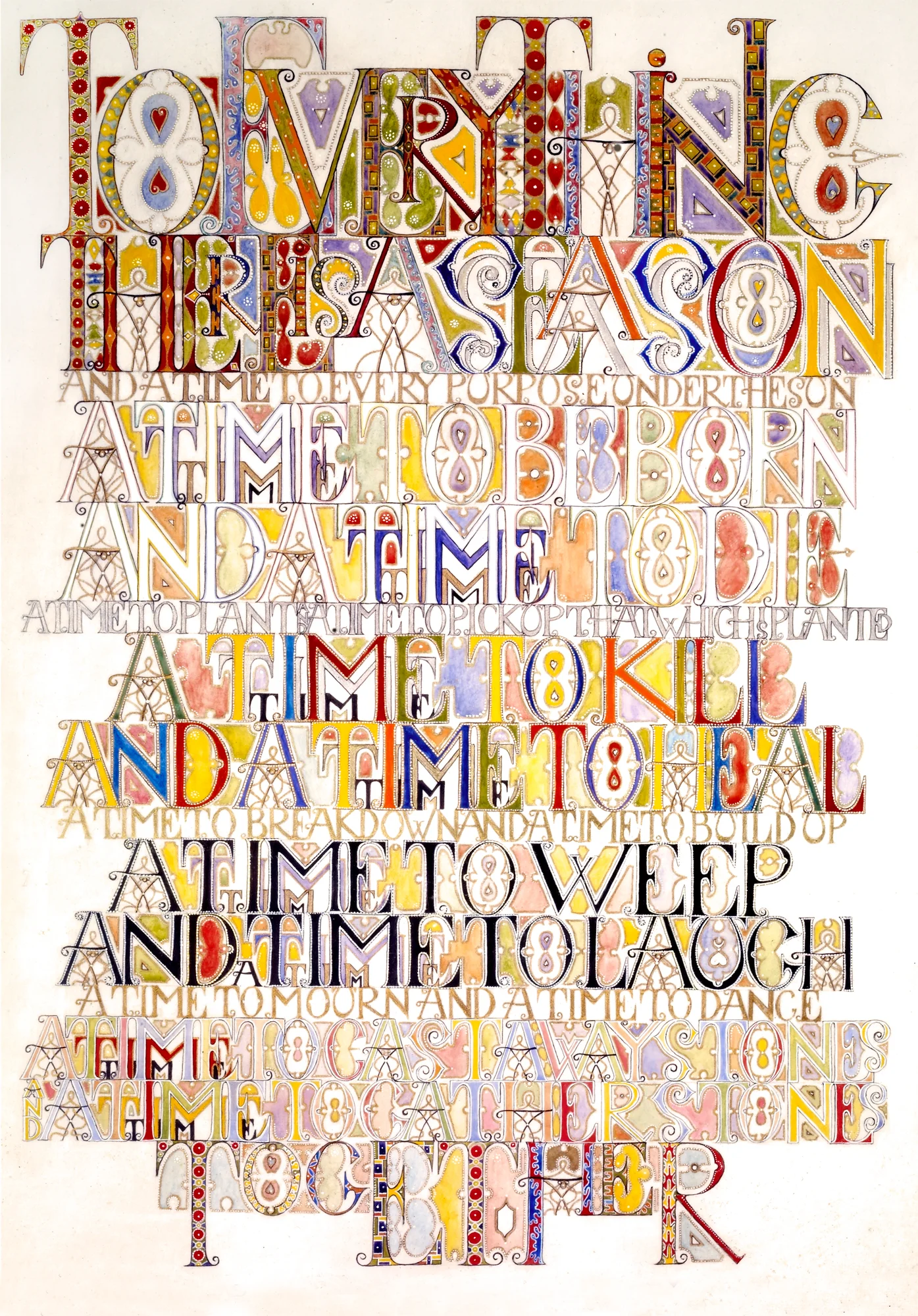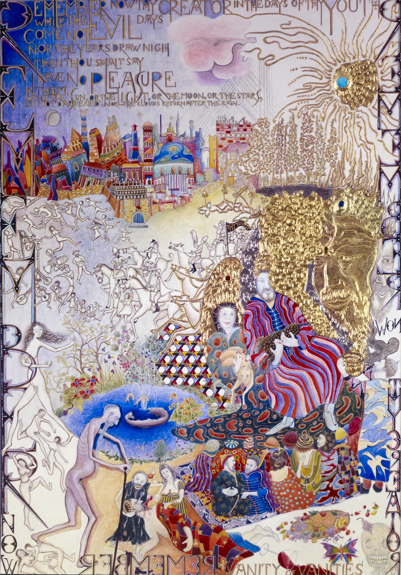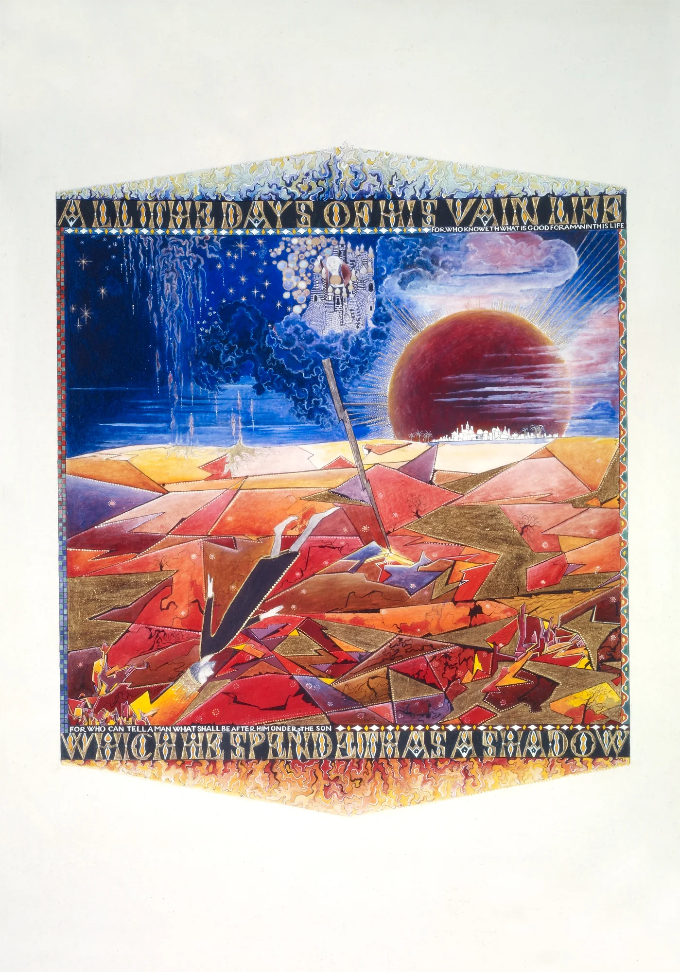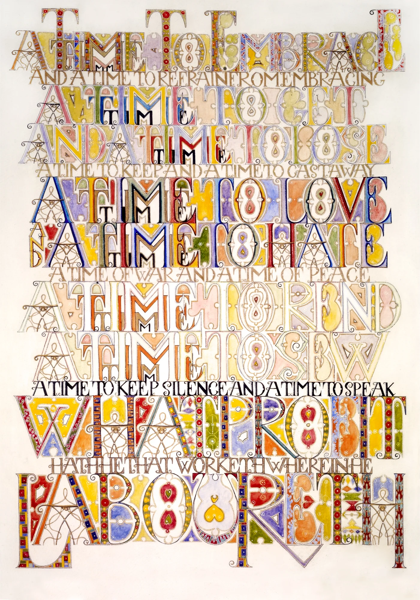Ecclesiastes is an illuminated manuscript on 67 pages of vellum made with egg tempera, gold and silver leaf, precious and semi-precious stones. It was privately commissioned and took six years to make. It includes 34 illuminations, which you can see below, 32 pages of calligraphy and one title page. The size of each page is 28x42cm. Facsimile prints of the original manuscript available as single or double pages.